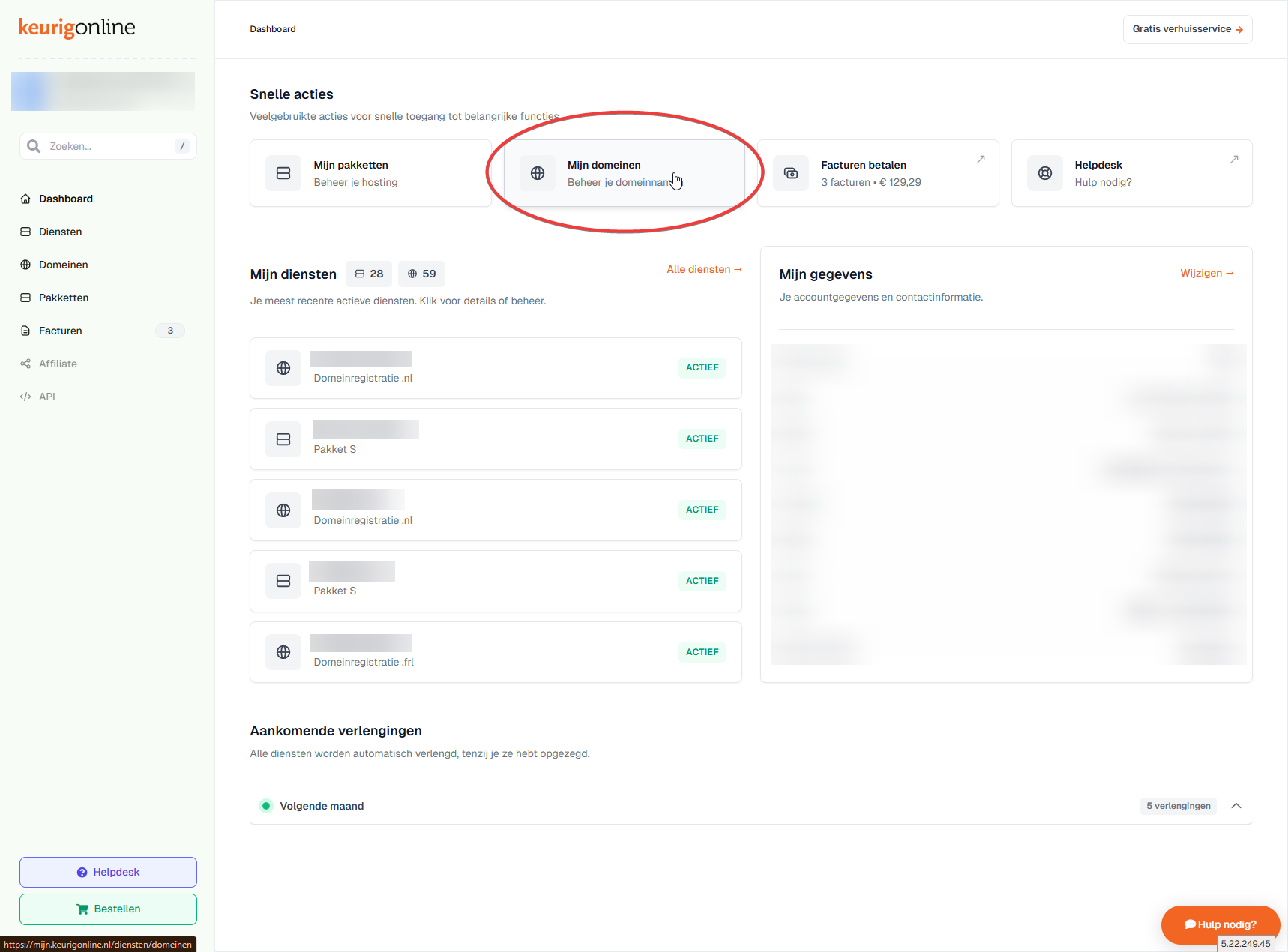 Zodra je bent ingelogd op het dashboard zie je een overzicht van je actieve diensten. Hier klik je op Mijn domeinen