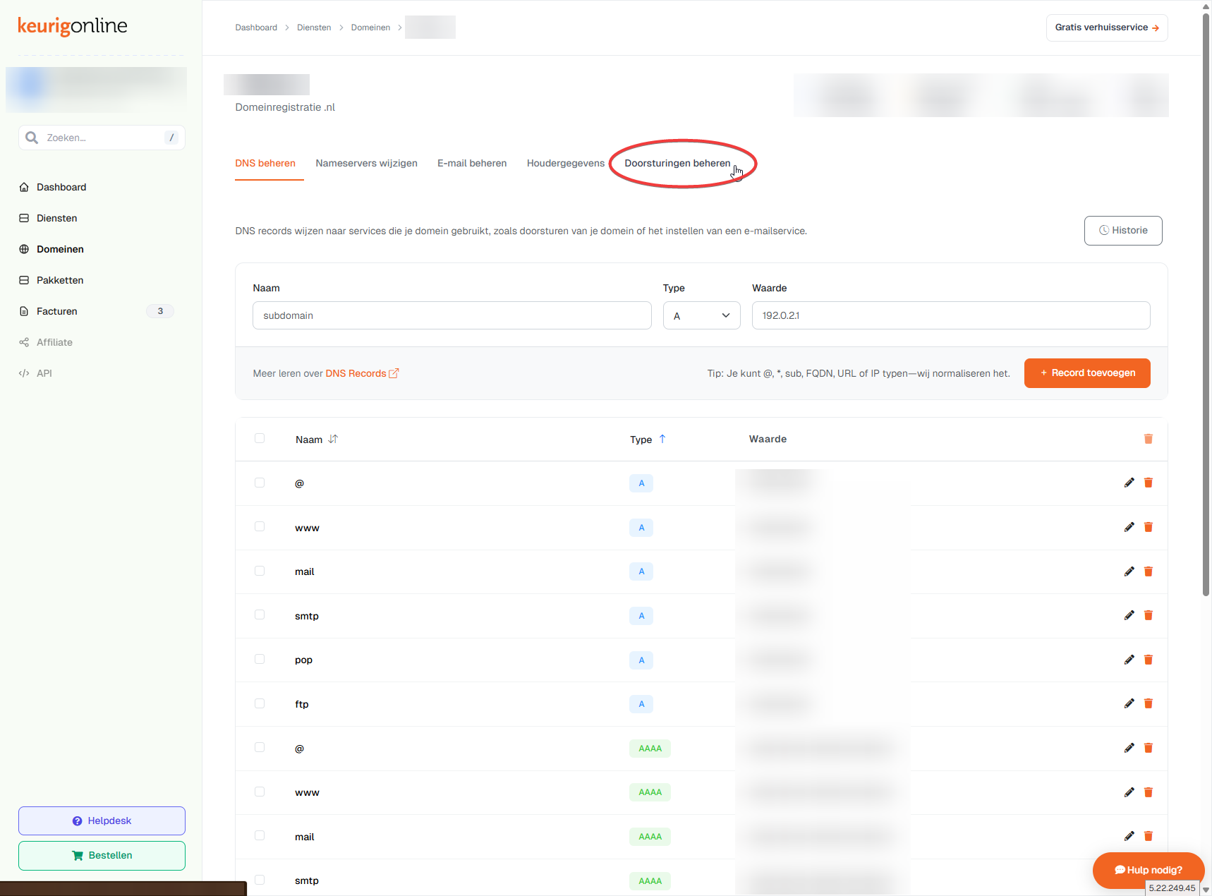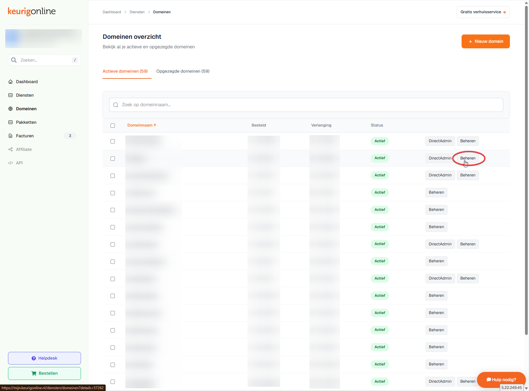 Om de doorsturing in te stellen van je domeinnaam klik je op de knop 'Beheren' achter de betreffende domeinnaam