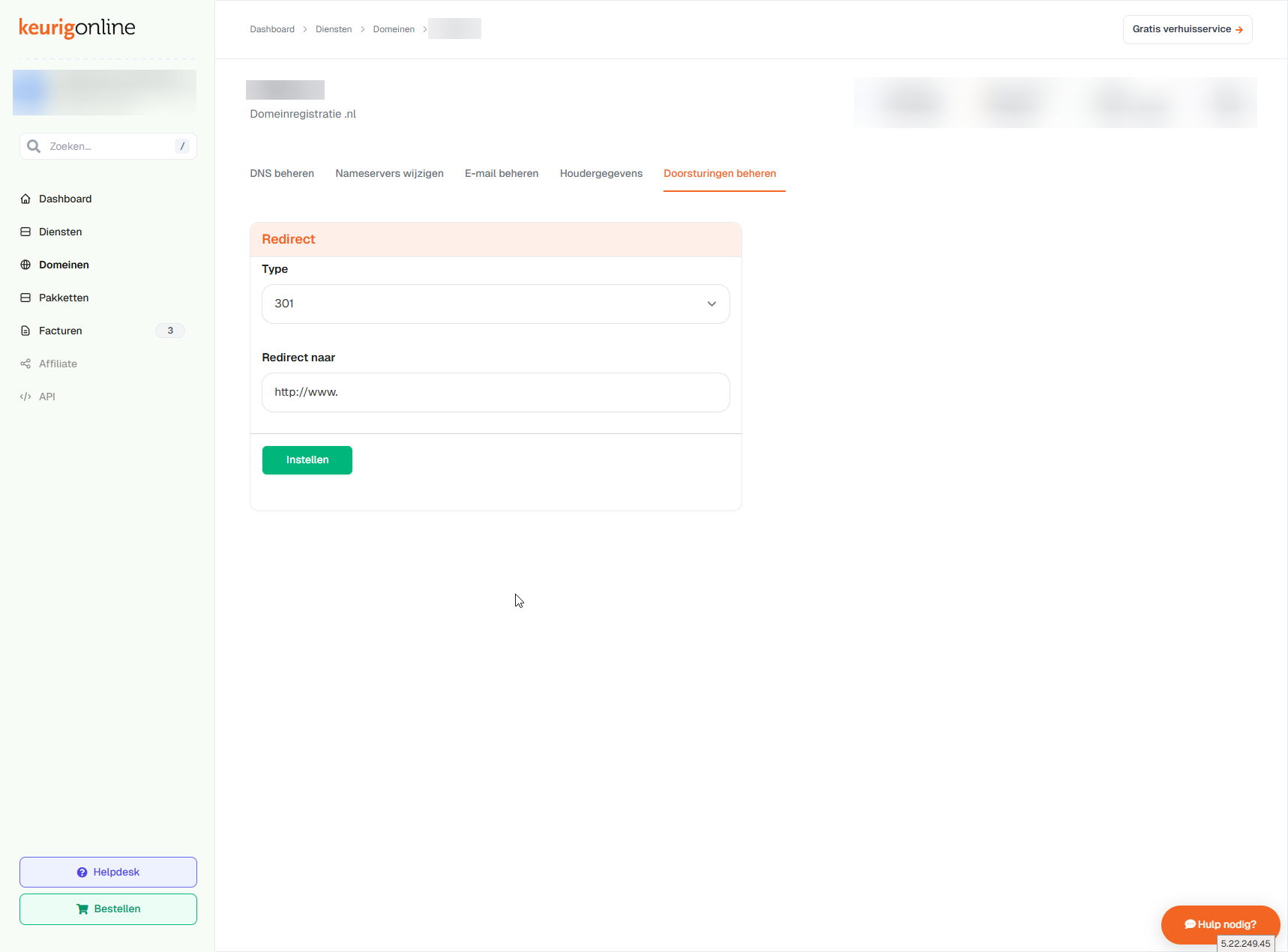 Er volgt nu een kolom waarop je de doorsturing in kan stellen. Vul bij 'Redirect naar' het volledige pad in, inclusief https://